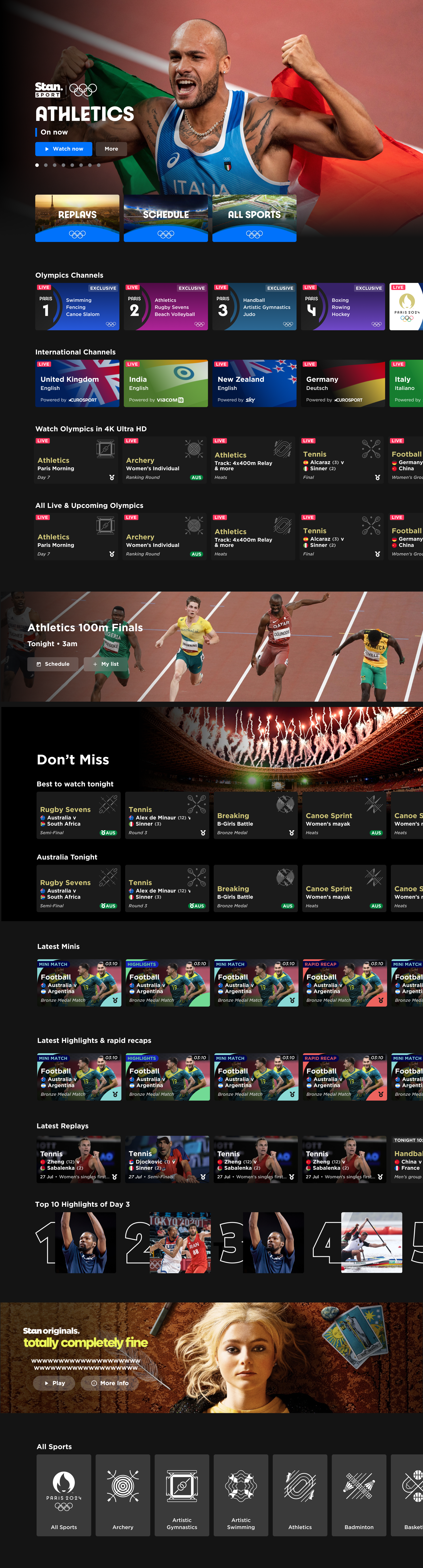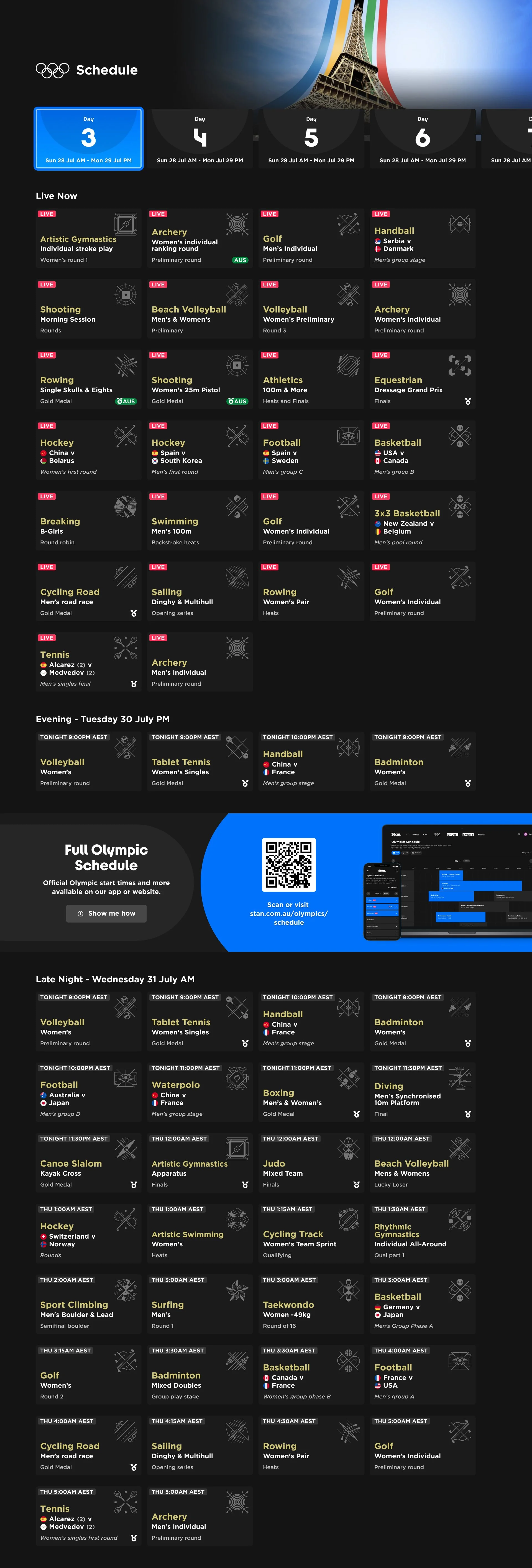 With an 8 hour time difference to Paris, the peak of the action is 3am. While the world watches the 100m Final and Swimming Golds - Australia will be asleep. Only few tentpole events are at reasonable hours (Before 1am and after 6am). Allow users to take control and catch up how they like, with full replays, highlights and short form content front and centre.