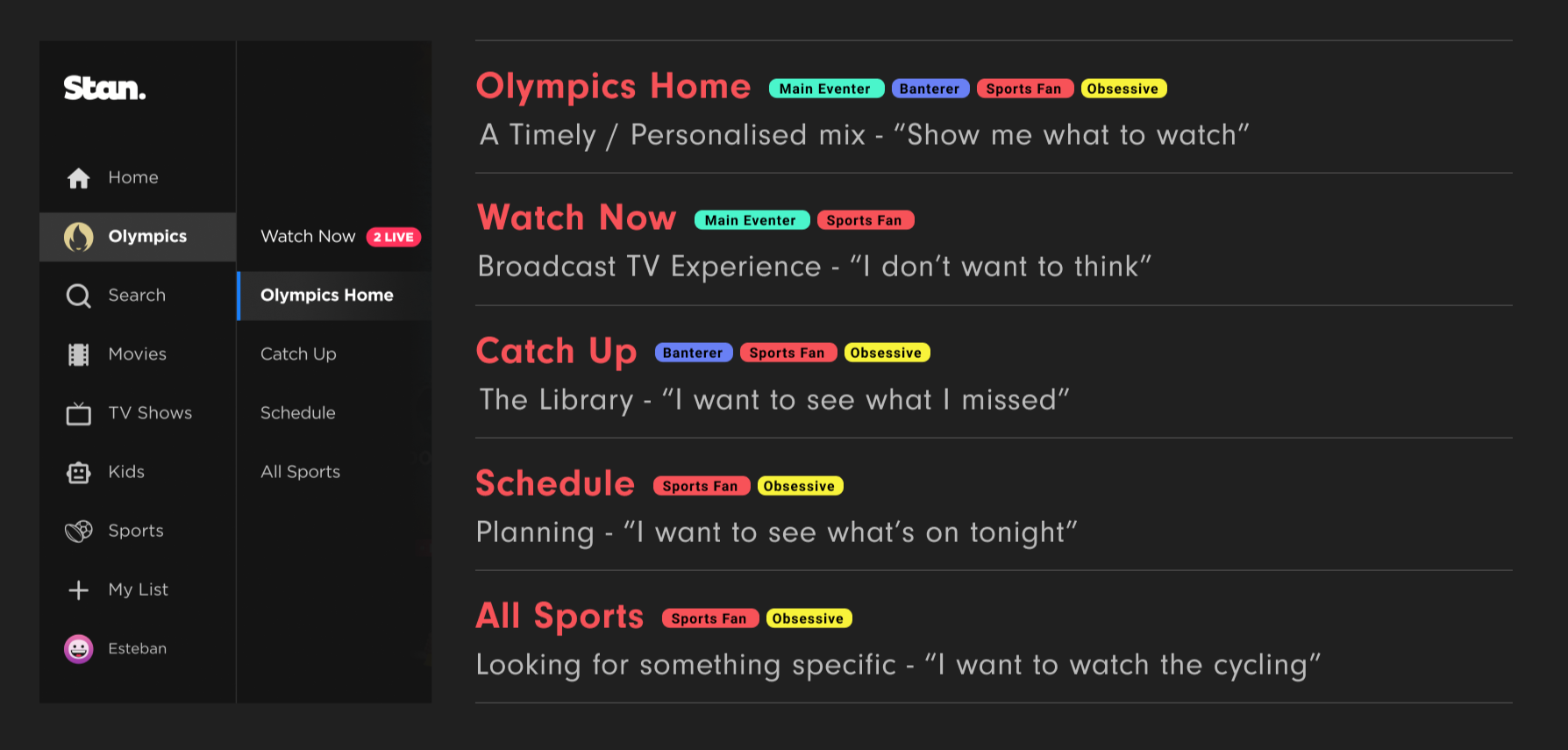 While my colleague audited Stan’s IA and current state, I focussed on the Games themselves. I explored all Olympic disciplines, understood key tentpole events, athletes and Stan’s content offering, collected insights on a board my colleague jokingly called ‘unhinged’ pre-tidy up.