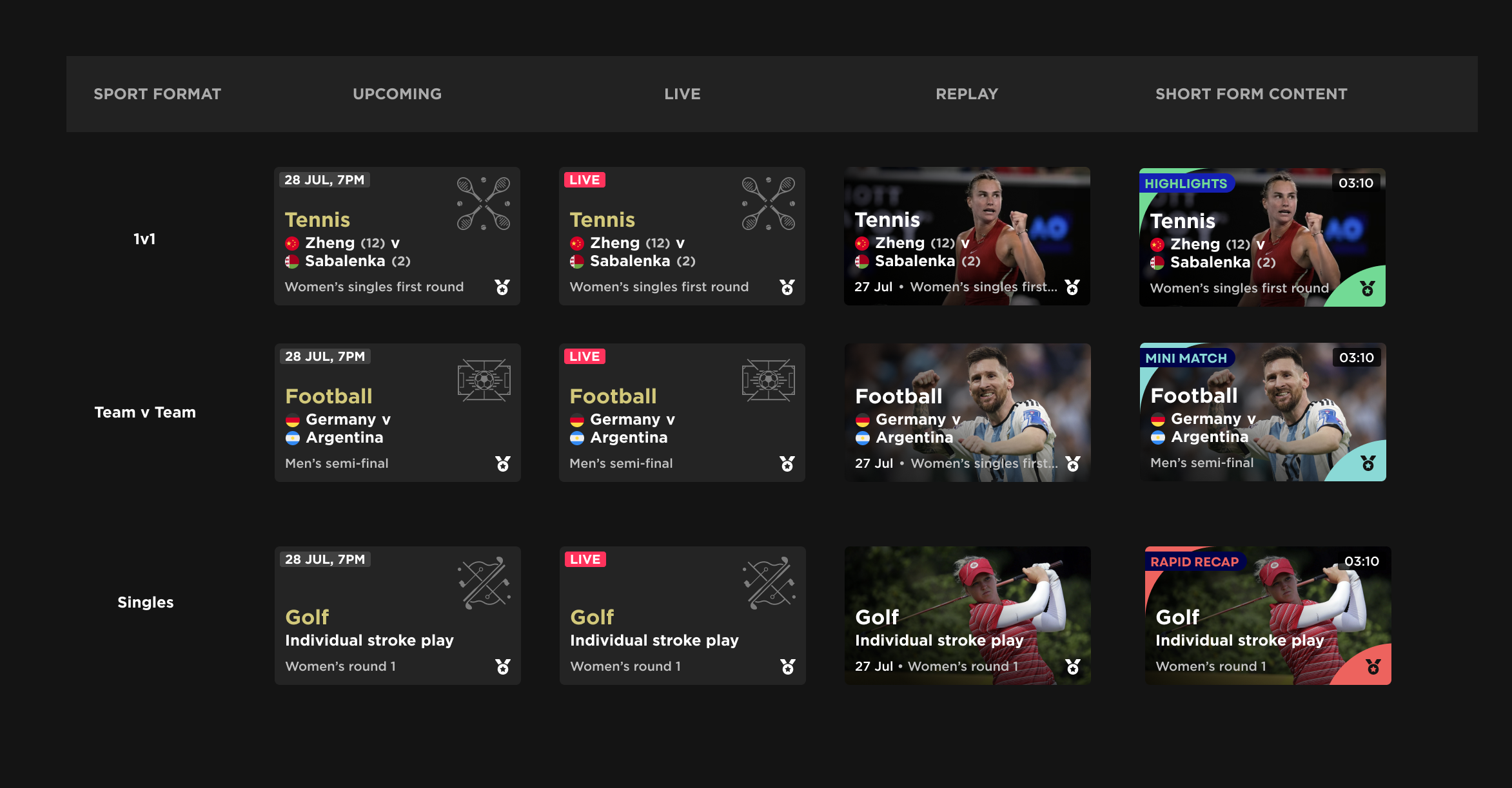 To recreate the Olympic archive concept, I created the day-selector header, displaying competition days in descending order and reusing existing content merchandising with a focused interaction state. Post-Games, this functioned as a complete archive of the Paris Olympics. Similarly to home, we led the content strategy of this page